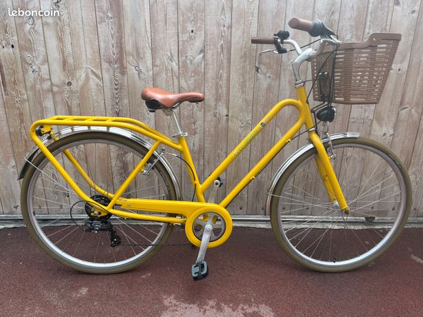 Description : vélo jaune en excellent état. Les pneus à regonfler légérement, mais tout le matériel (casque, pompe, lampe,...) peuvent être empruntées